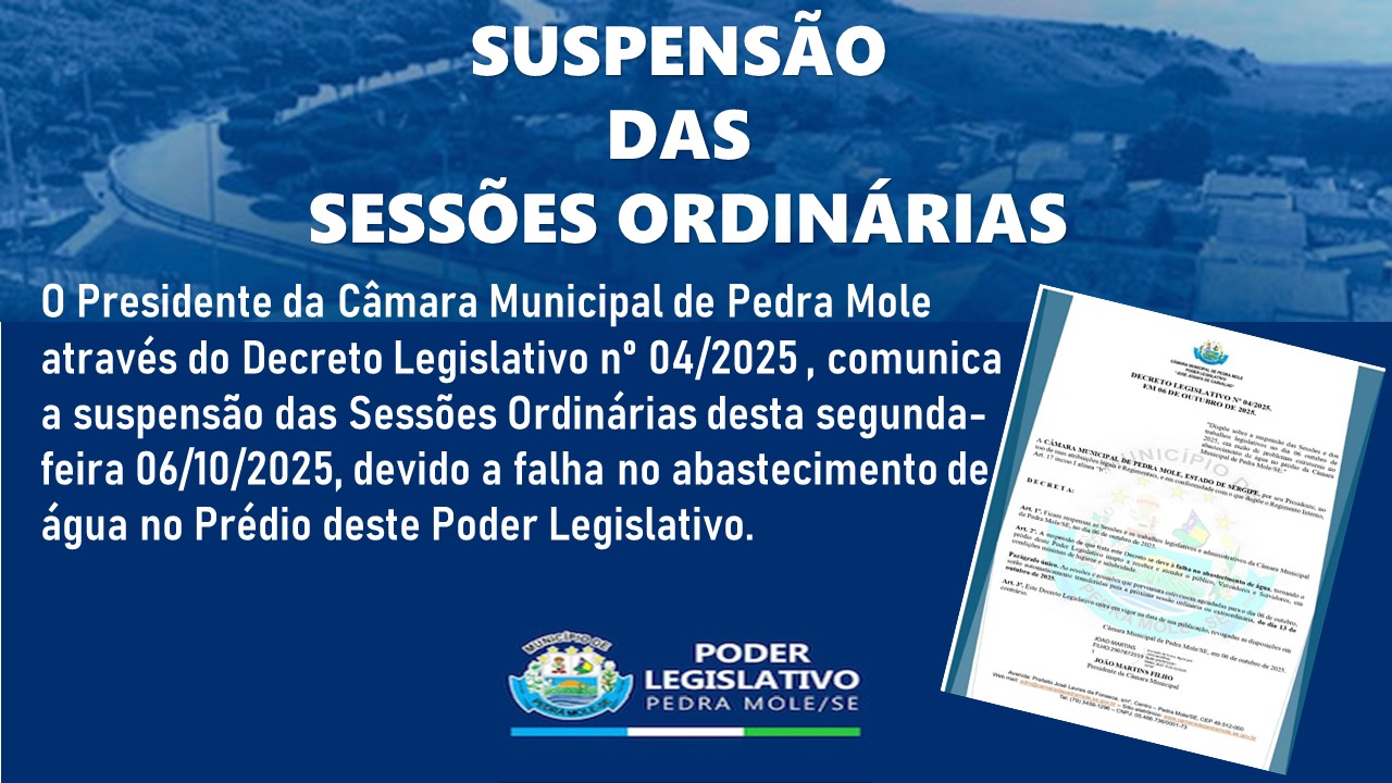 O Presidente da Câmara Municipal de Pedra Mole através do Decreto Legislativo nº 04/2025 , comunica a suspensão da Sessões Ordinárias desta segunda-feira 06/10/2025, devido a falha no abastecimento de água no Prédio deste Poder Legislativo.